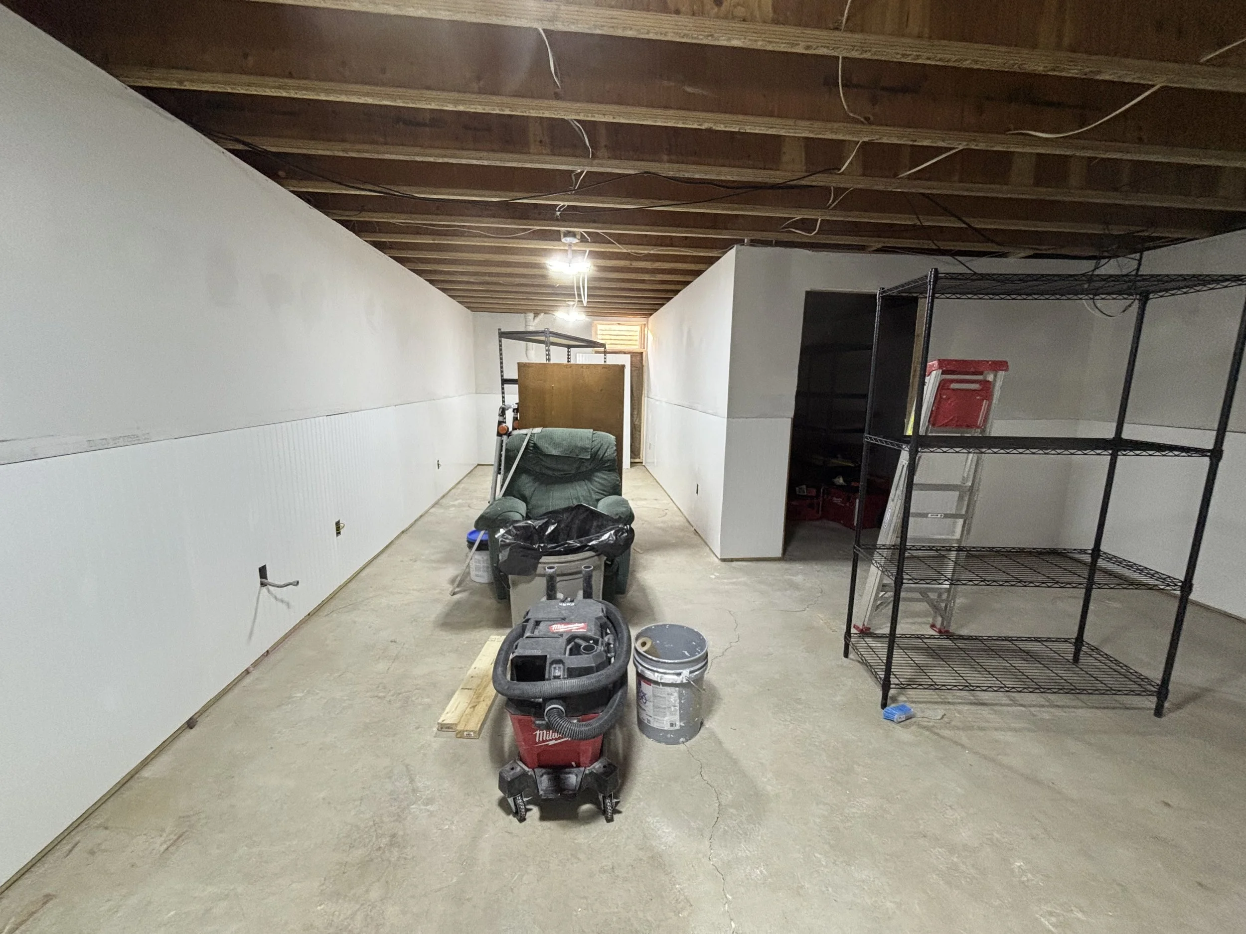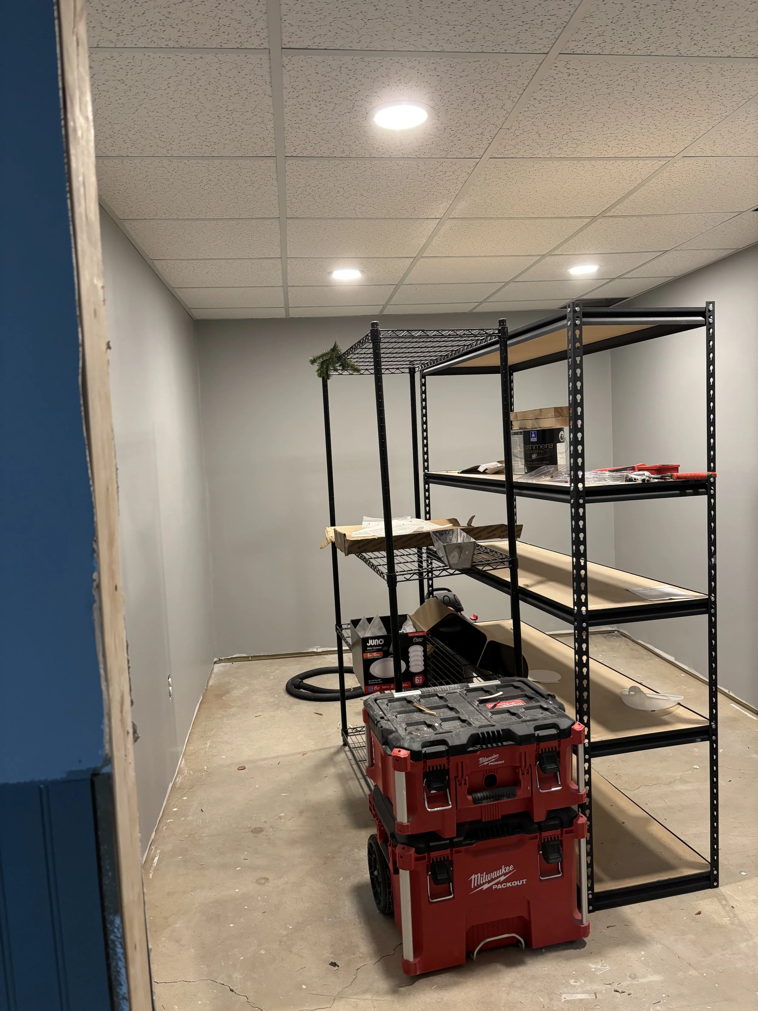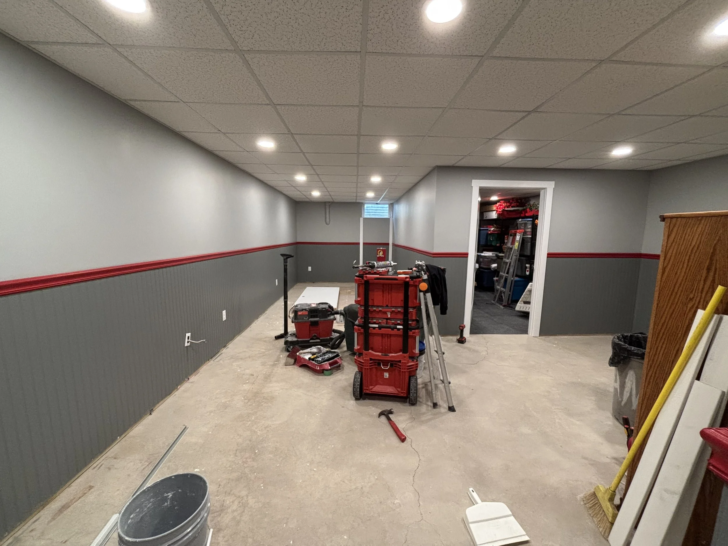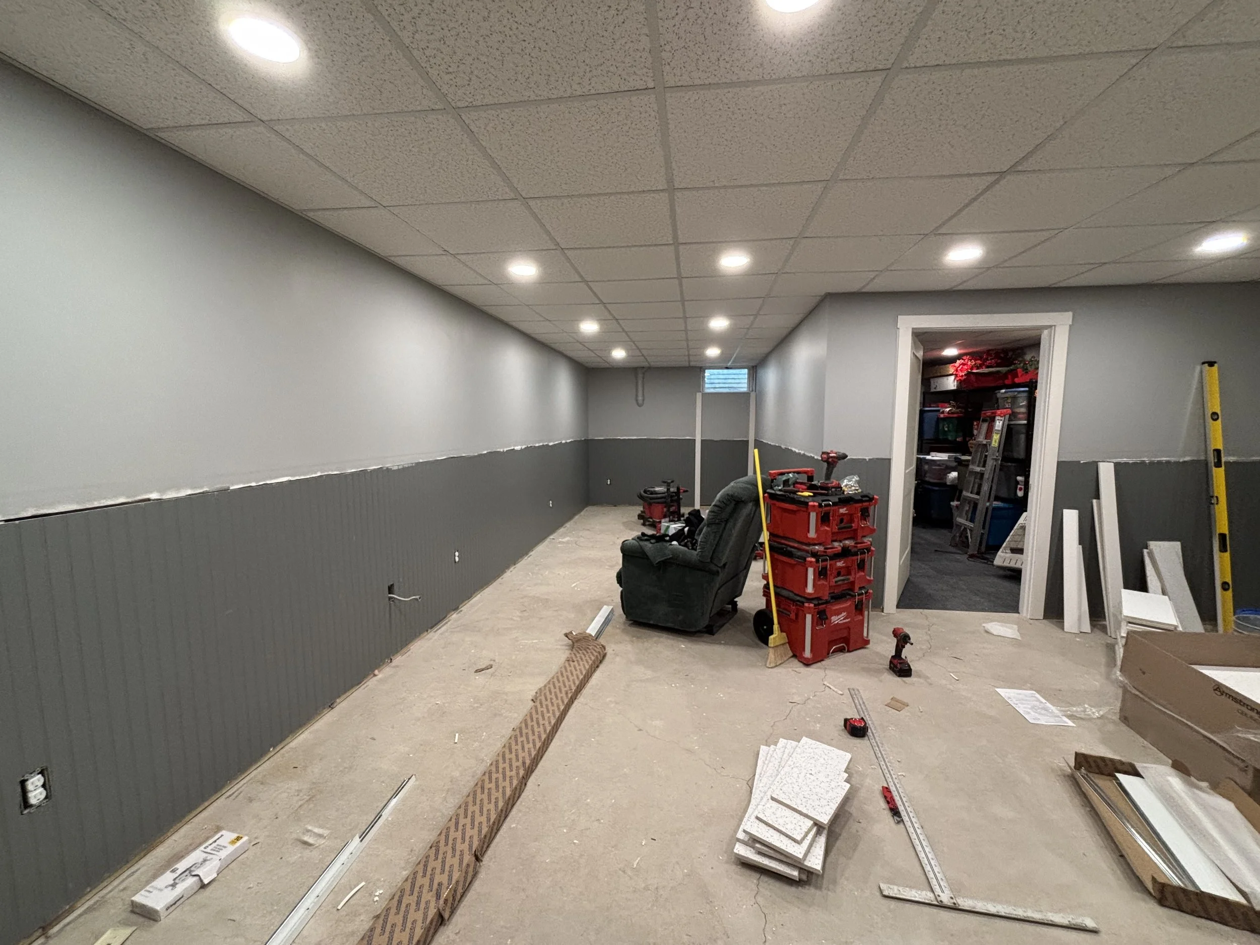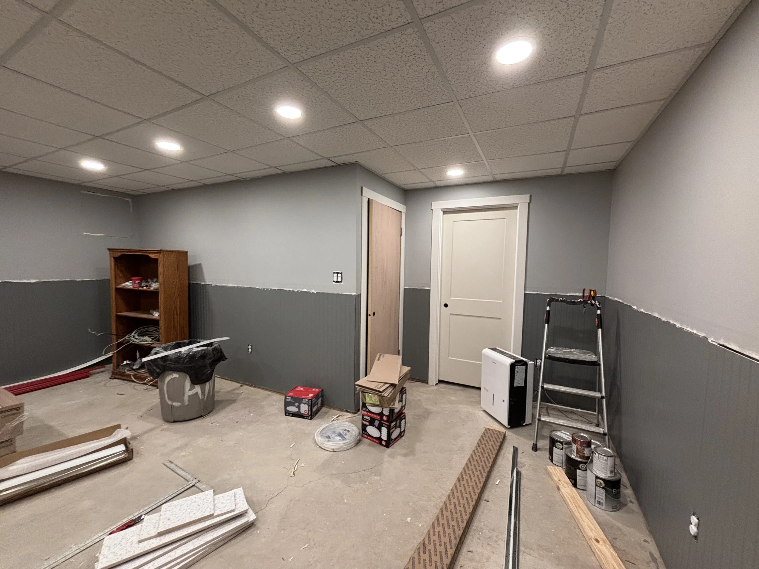 Boards are in and now it’s time to tape, mud, sand, prime, paint. I got P&J Services to come help out with the priming of the walls (they had most of the week off school due to the previous weekend snowstorm). The homeowners also (smartly) decided on a drop ceiling, so that would be going in after the walls were painted. I had ran the electrical for lighting previously, so we were good to go.
