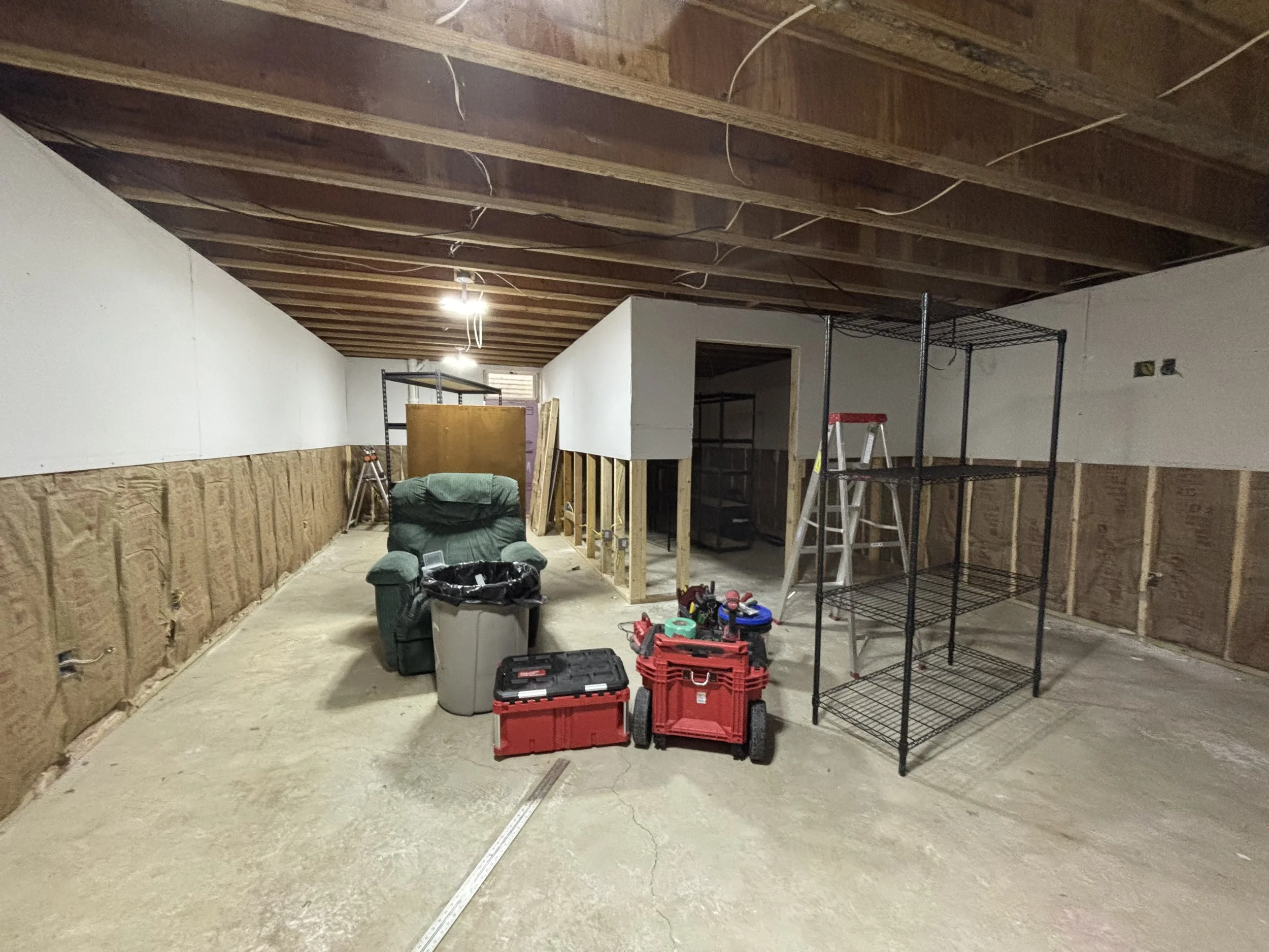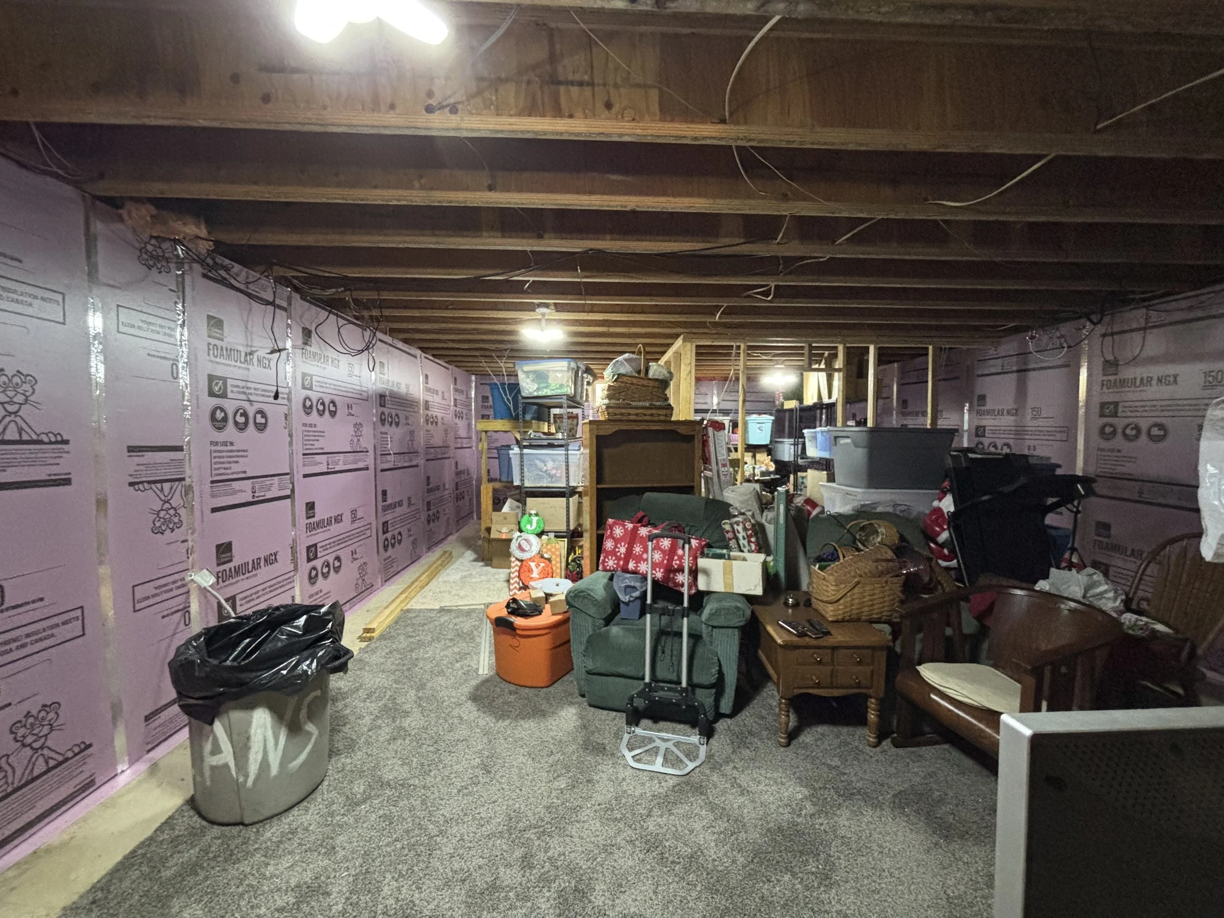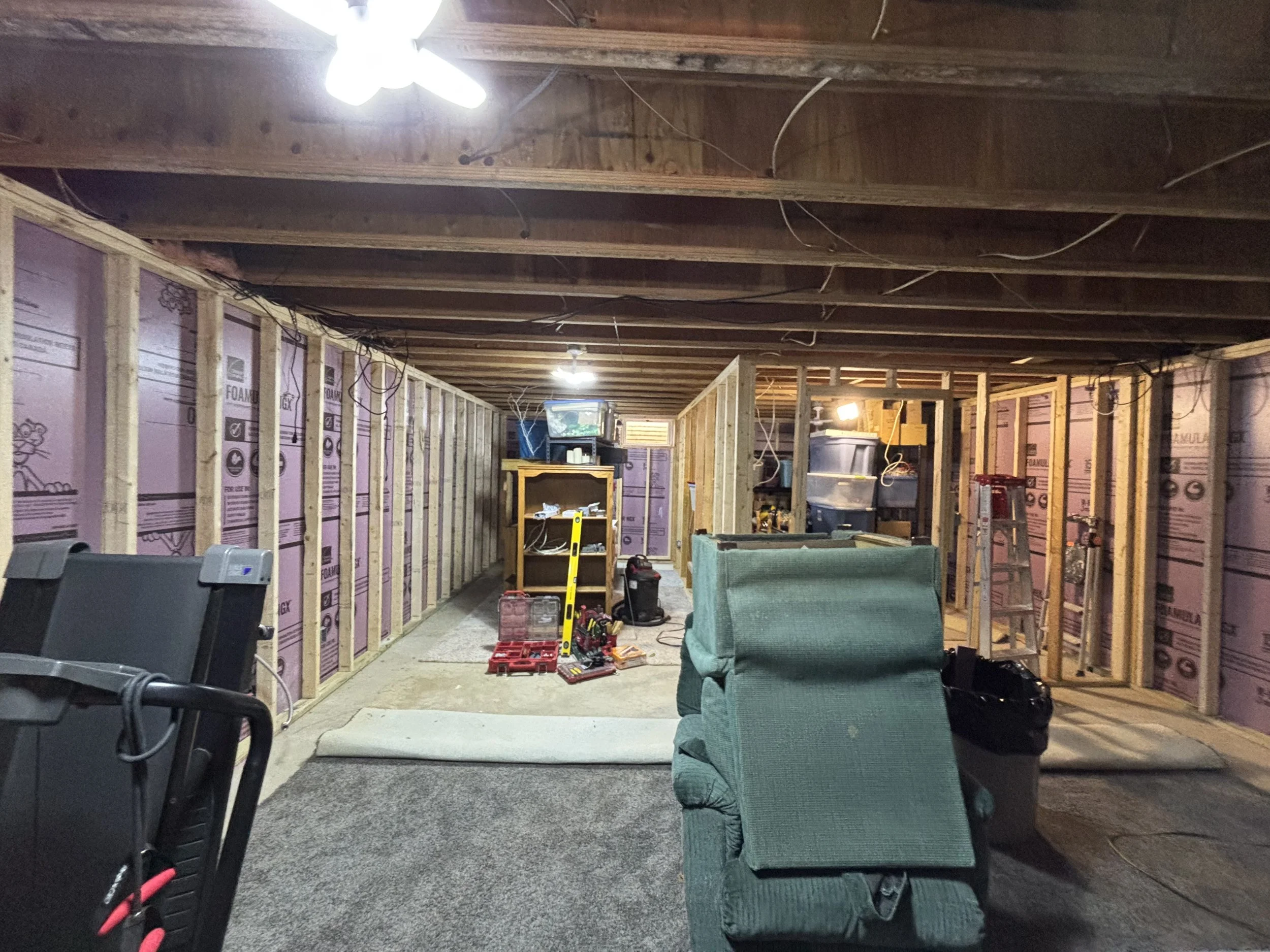I began by having the existing concrete walls clad with 1” Foam board. It is an R-5, but it also provided a crucial separation between concrete and studs that were going in next.