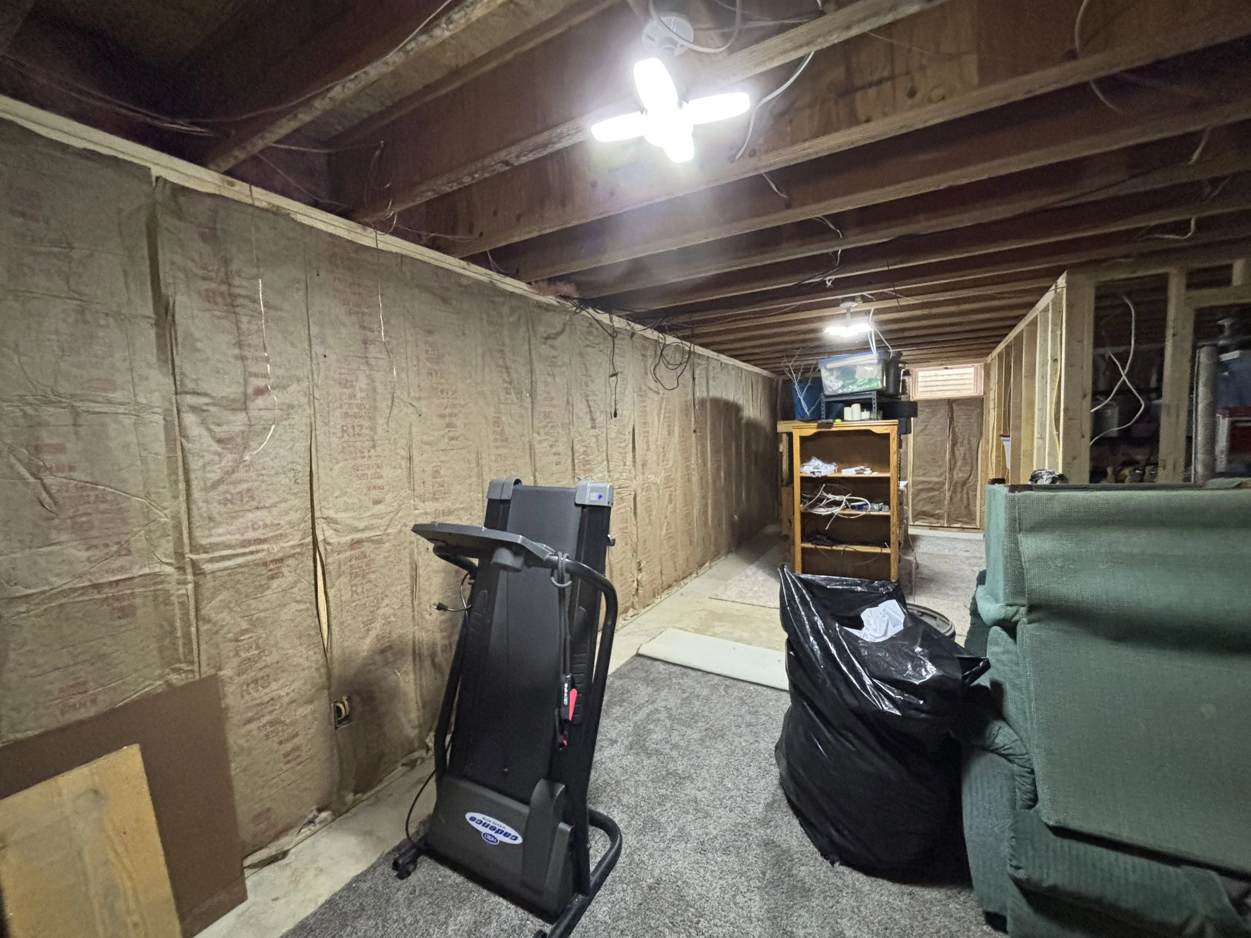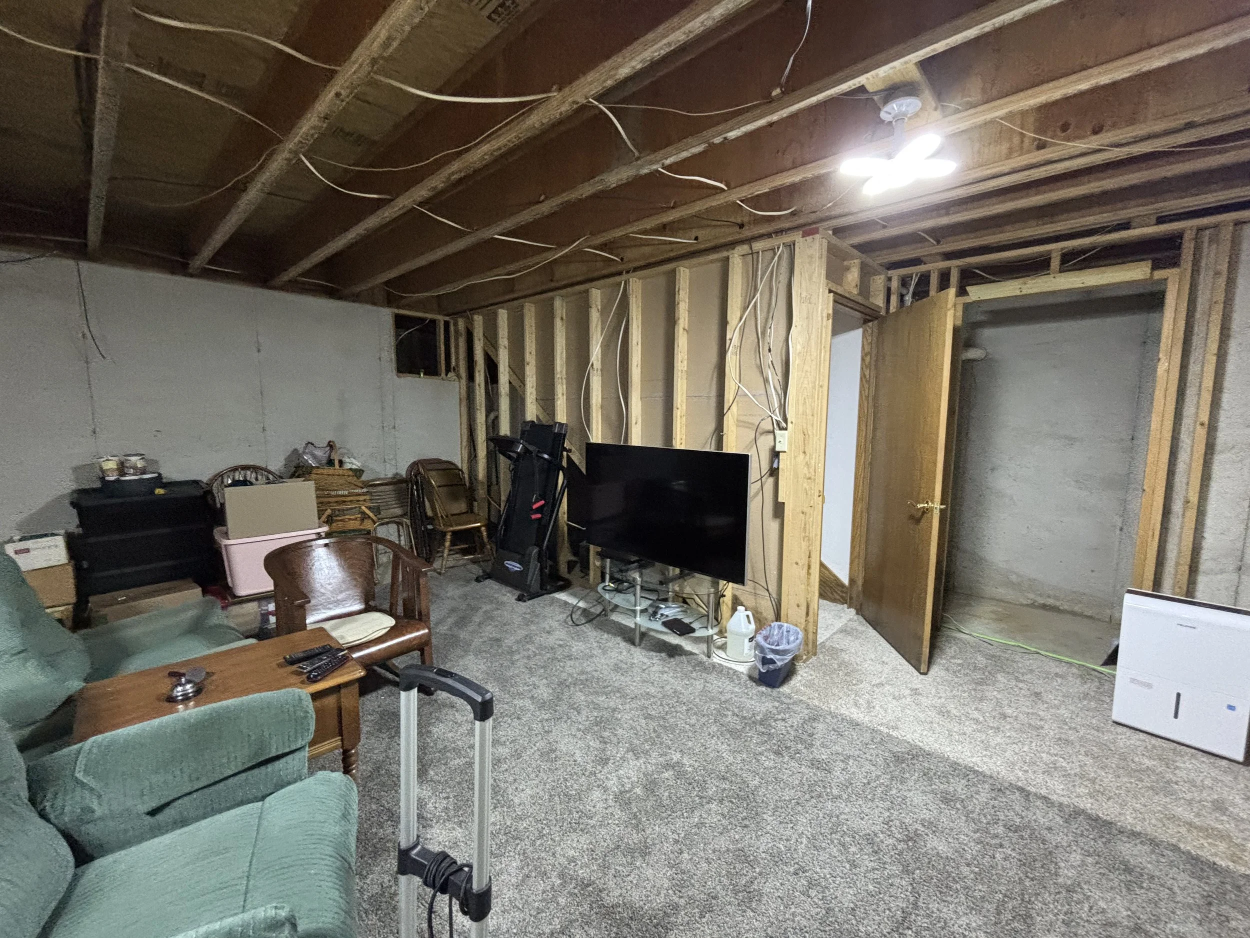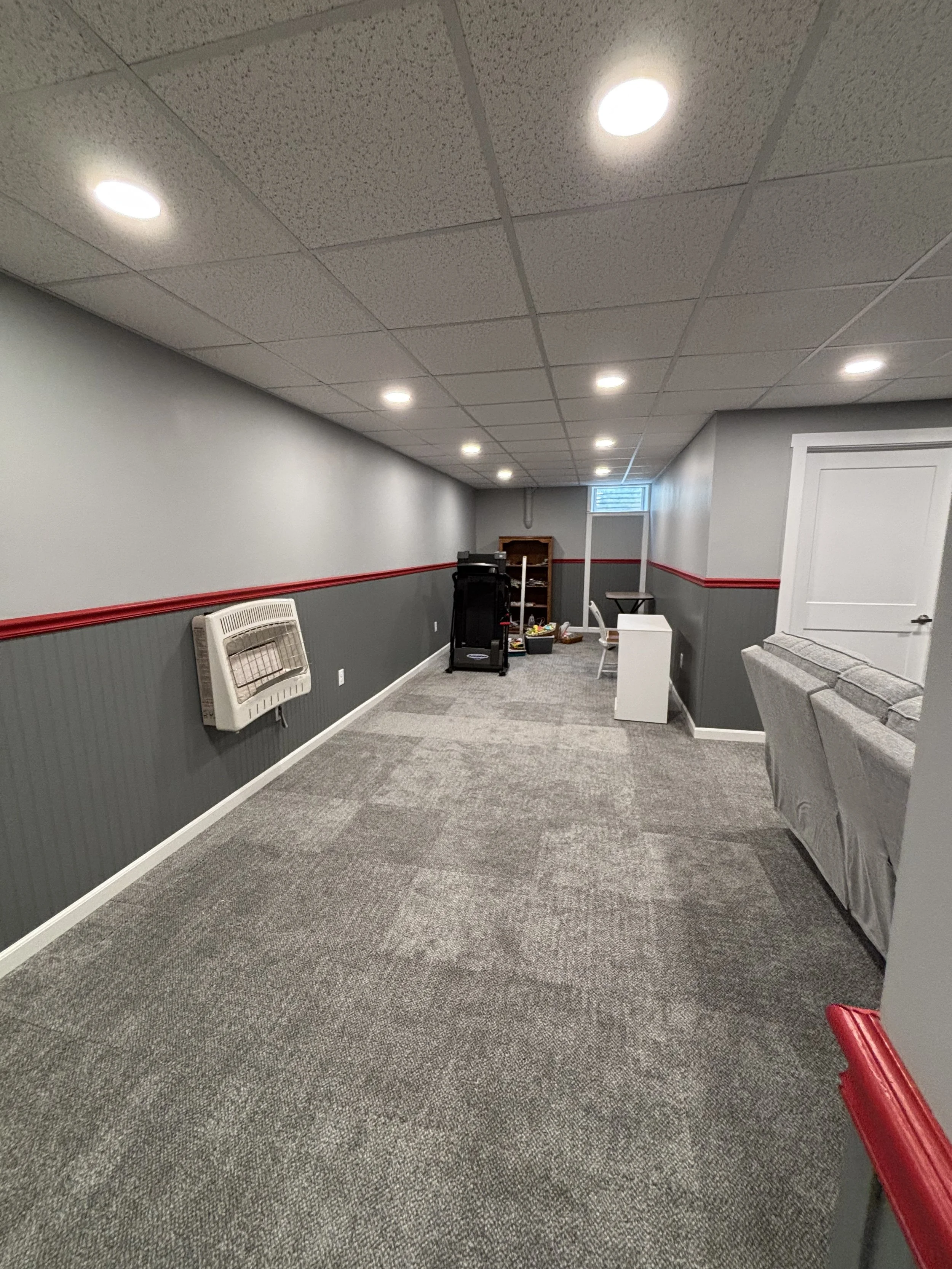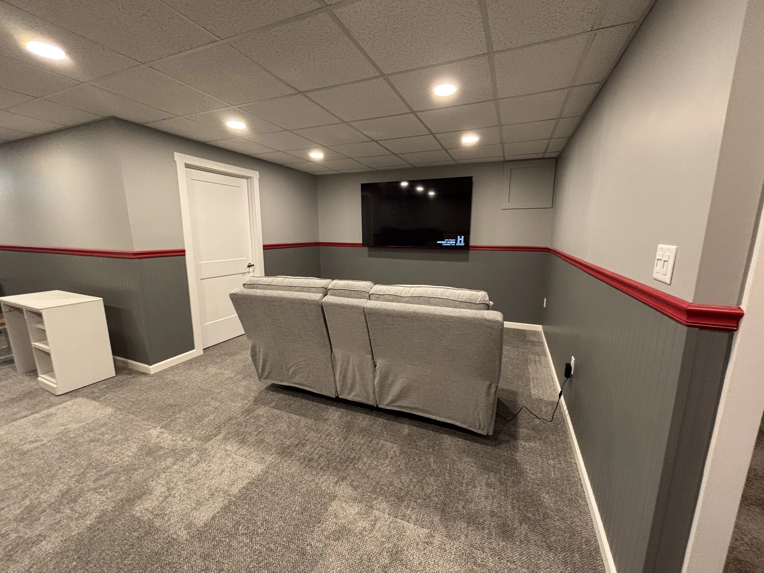In the above picture, the wall below the window is removable. When the basement floods, it comes in through the window, according to the homeowners. In that event, the wall can be removed to allow airflow and keep the mold situation at the minimum. After the carpet was in, the homeowners couldn’t wait to get the couch and TV downstairs and give the room its full test!