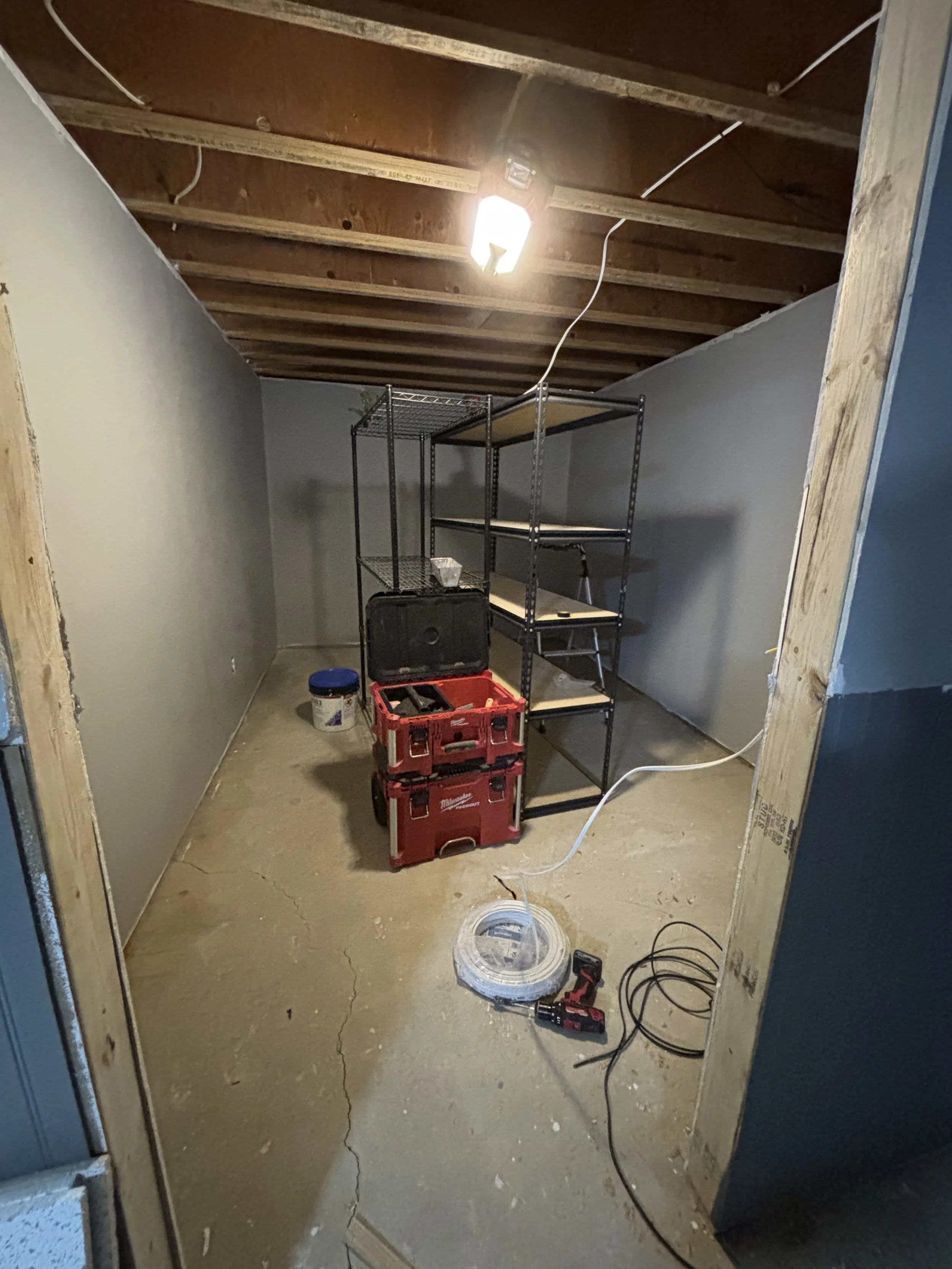 The homeowner wanted to see the following: 1) An enlarged and closed off storage area to keep the main room free of shelving. 2) Close off the sump pump mechanical room. 3) Allow an access panel for the crawlspace. 4) Allow for the only window to be able to be “dried out” in the event of a flood in the window well. 5) Be as waterproof as possible without breaking the bank.