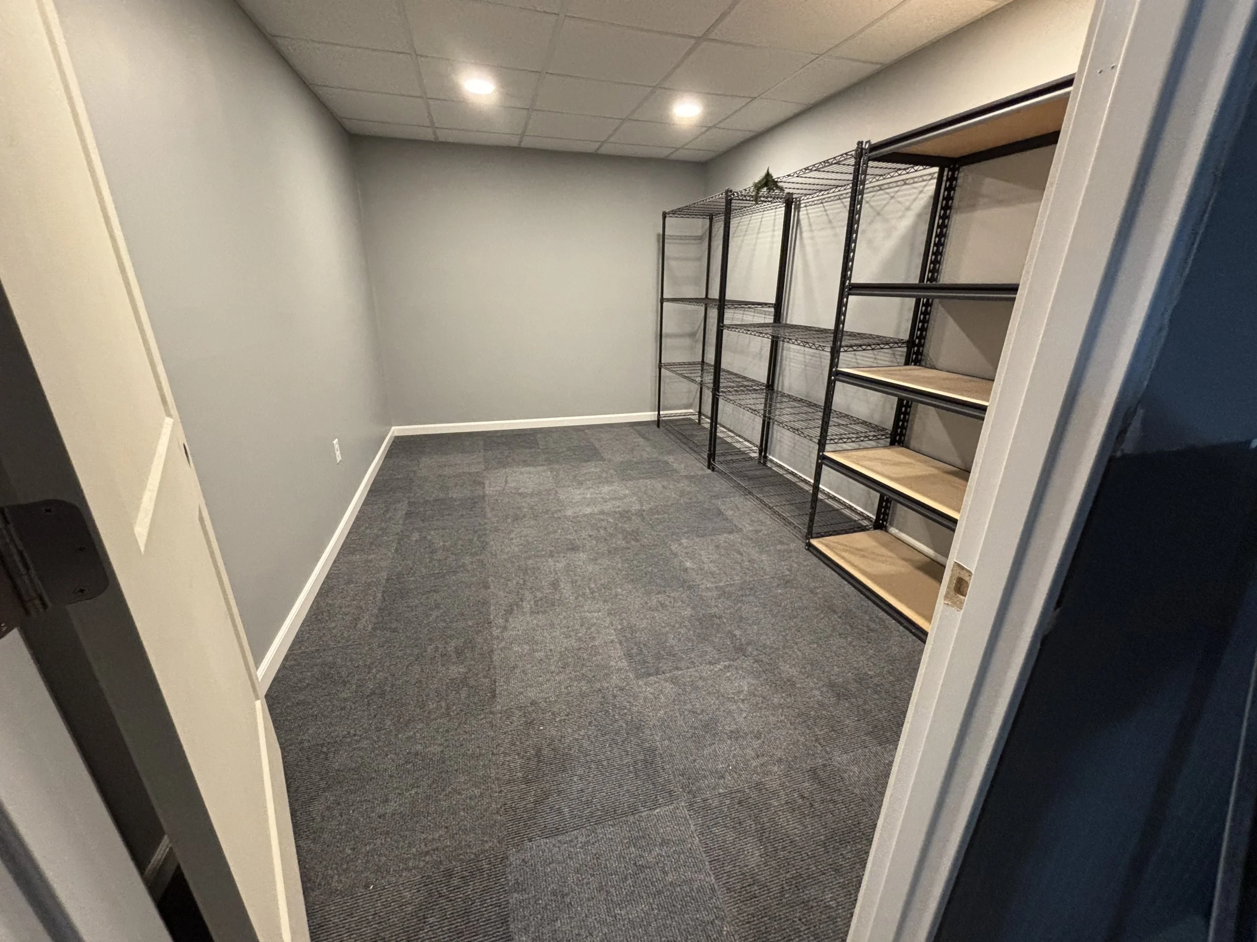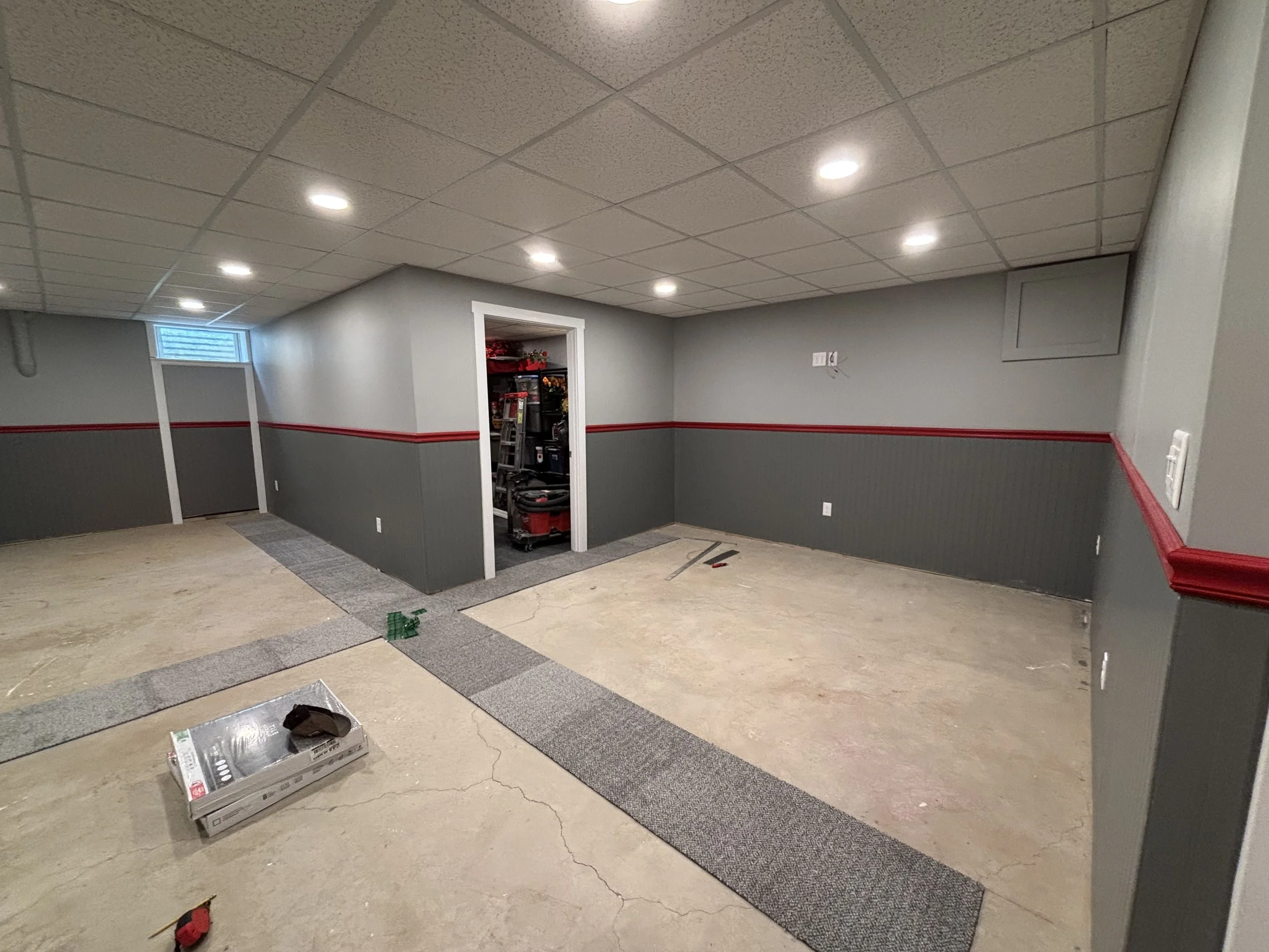They chose a self-adhesive carpet tile by Foss QuickFloor for their closet, and I think it was a great choice. They’re easy to pull up and replace after they eventually wear down, and will handle high traffic and water very well. I chose PVC base trim for the waterproofing quality and it’s, well, pre-finished white. Now that the closet was mostly finished, it was time to focus on the main room ceiling. One work day later, the ceiling grid was in and the lights were on.