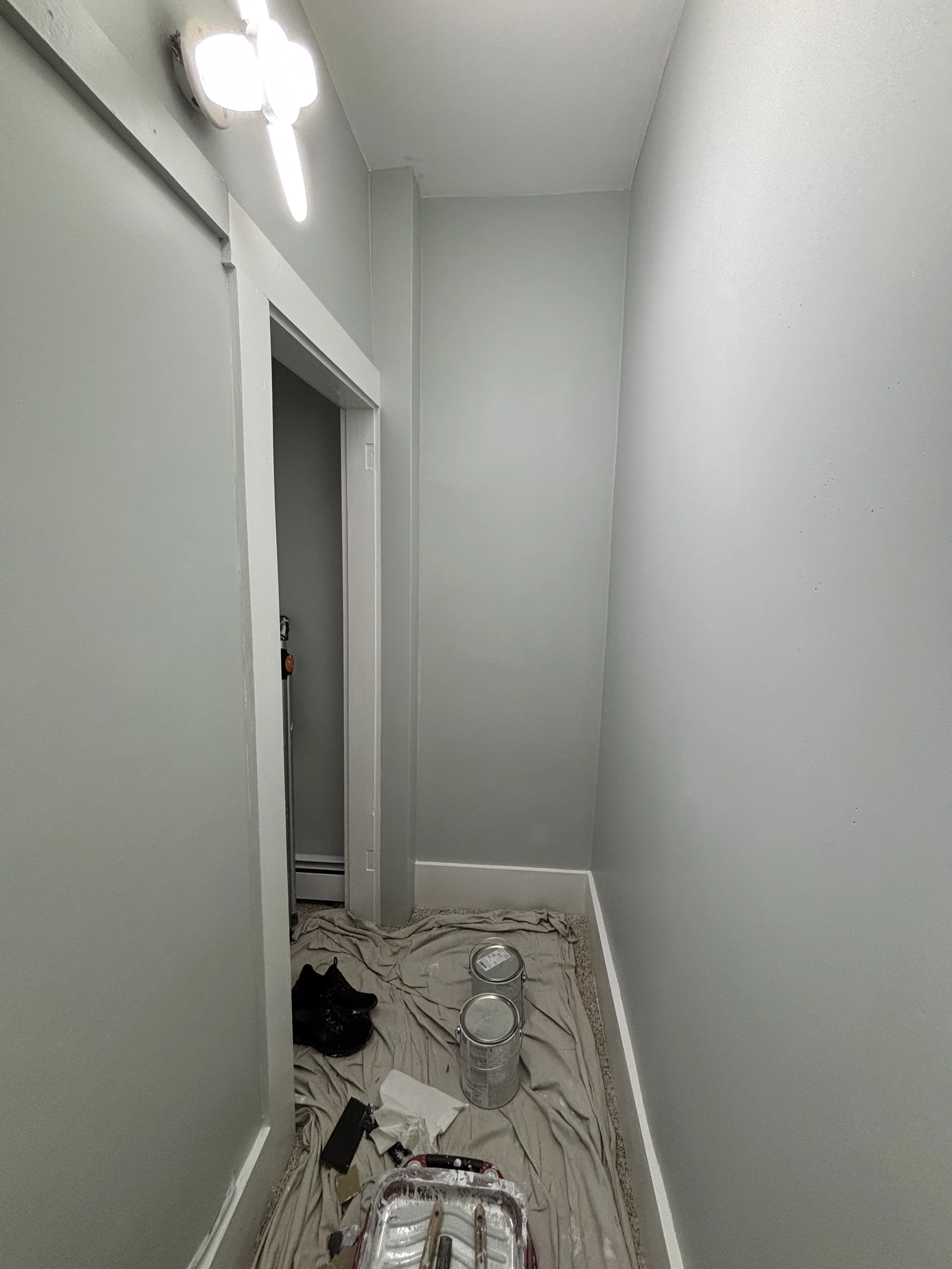 Once the paint went on, the closet really started to take shape. The walls were remarkably flatter, the corners were tighter, and the pipes were enclosed. Another bonus; mice had a super highway around where the pipes were coming out of the floor, and now had to find a new place to enter the home. Win/win. It was now time for the closet system to be installed. I chose the Closet Maid rail system for this particular closet because of its versatility and use case.