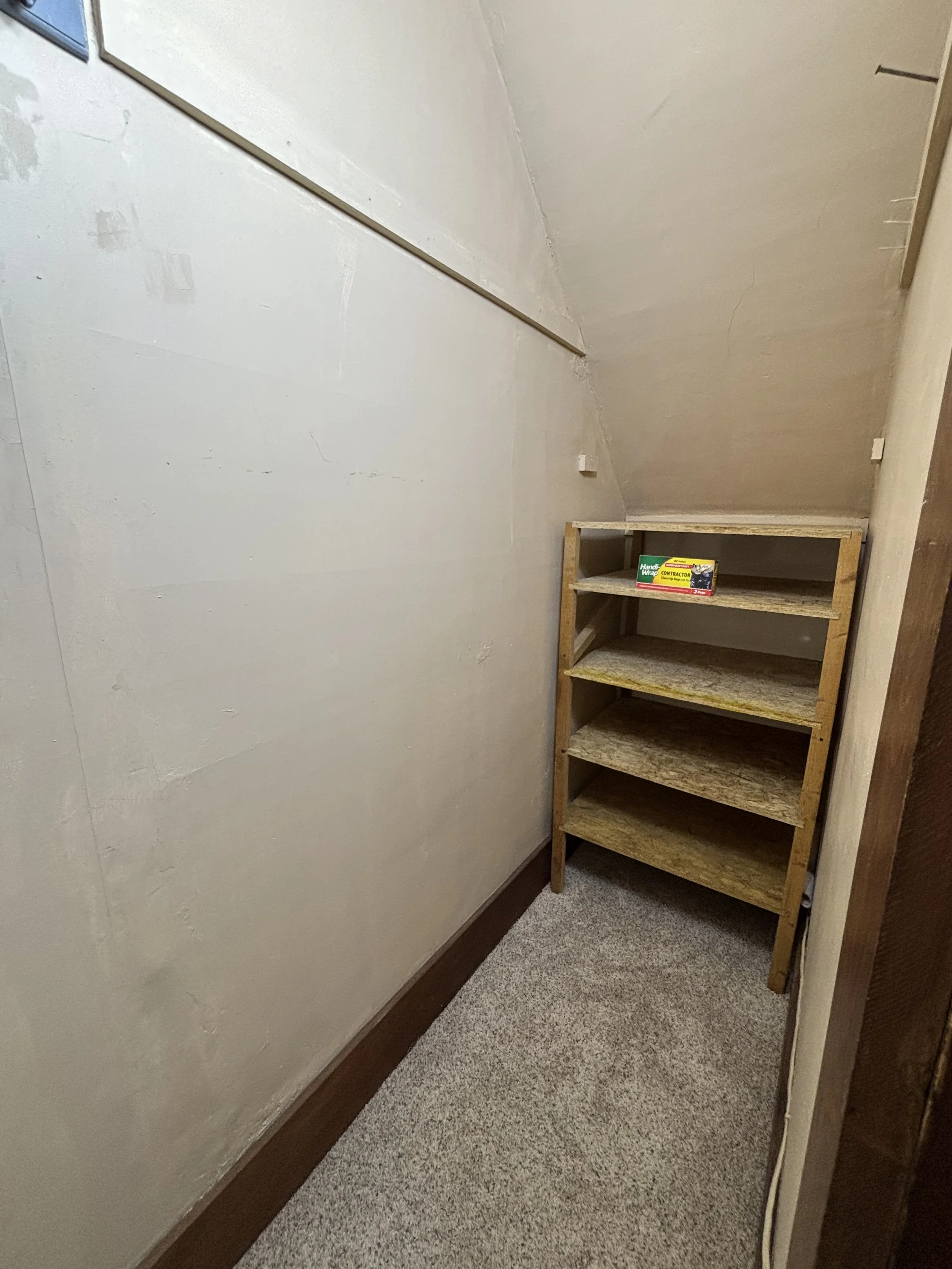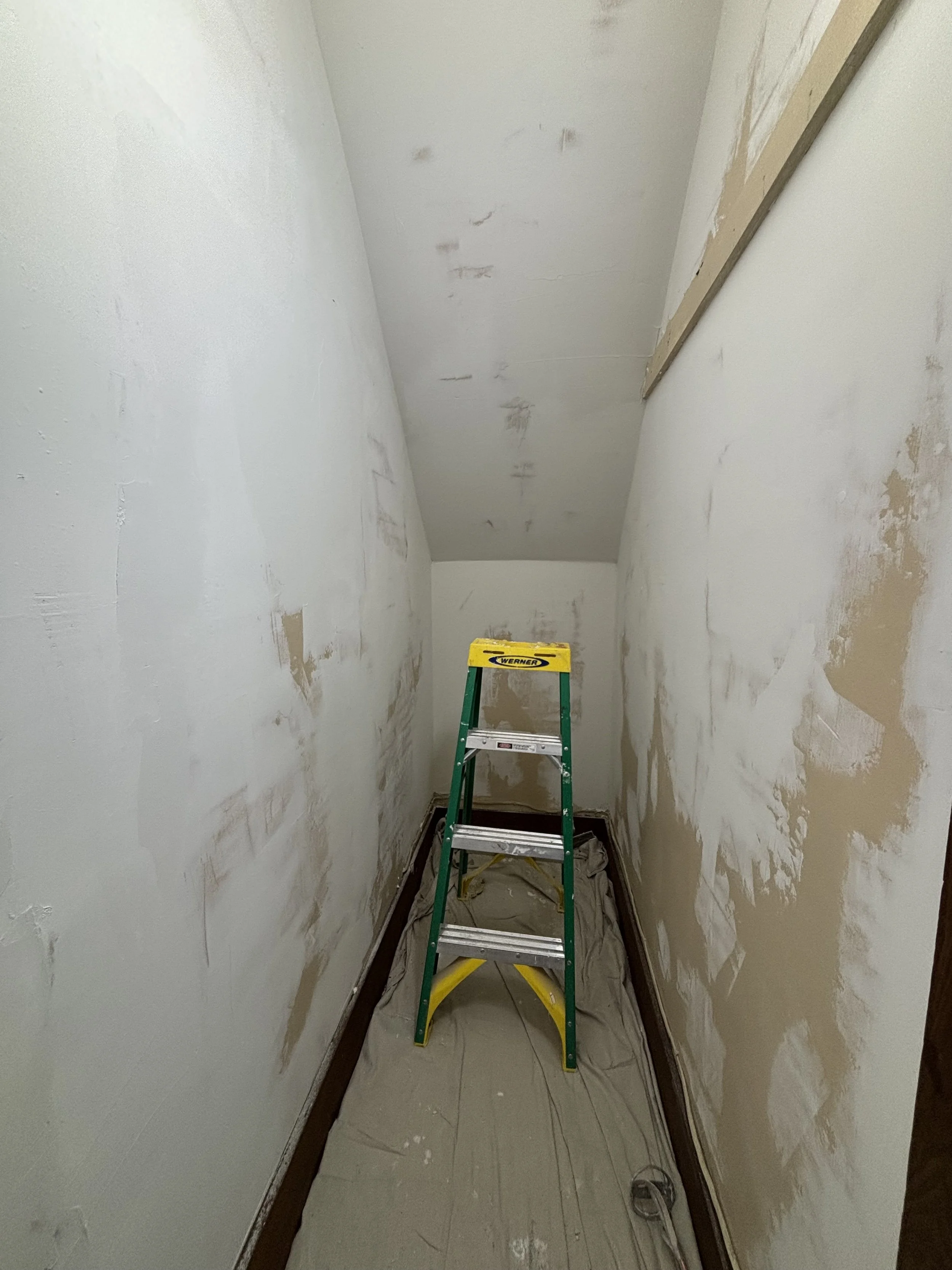 Under-the-Stair closets are a super cool place to hide stuff. This one was no exception. What made this one an exception was that the walls’ plaster was crumbling and there was quite a bit of less-than-enthusiastic repair done over the years. It also had exposed boiler pipes that the homeowner wanted covered. There was room for improvement, so let’s get improving!
