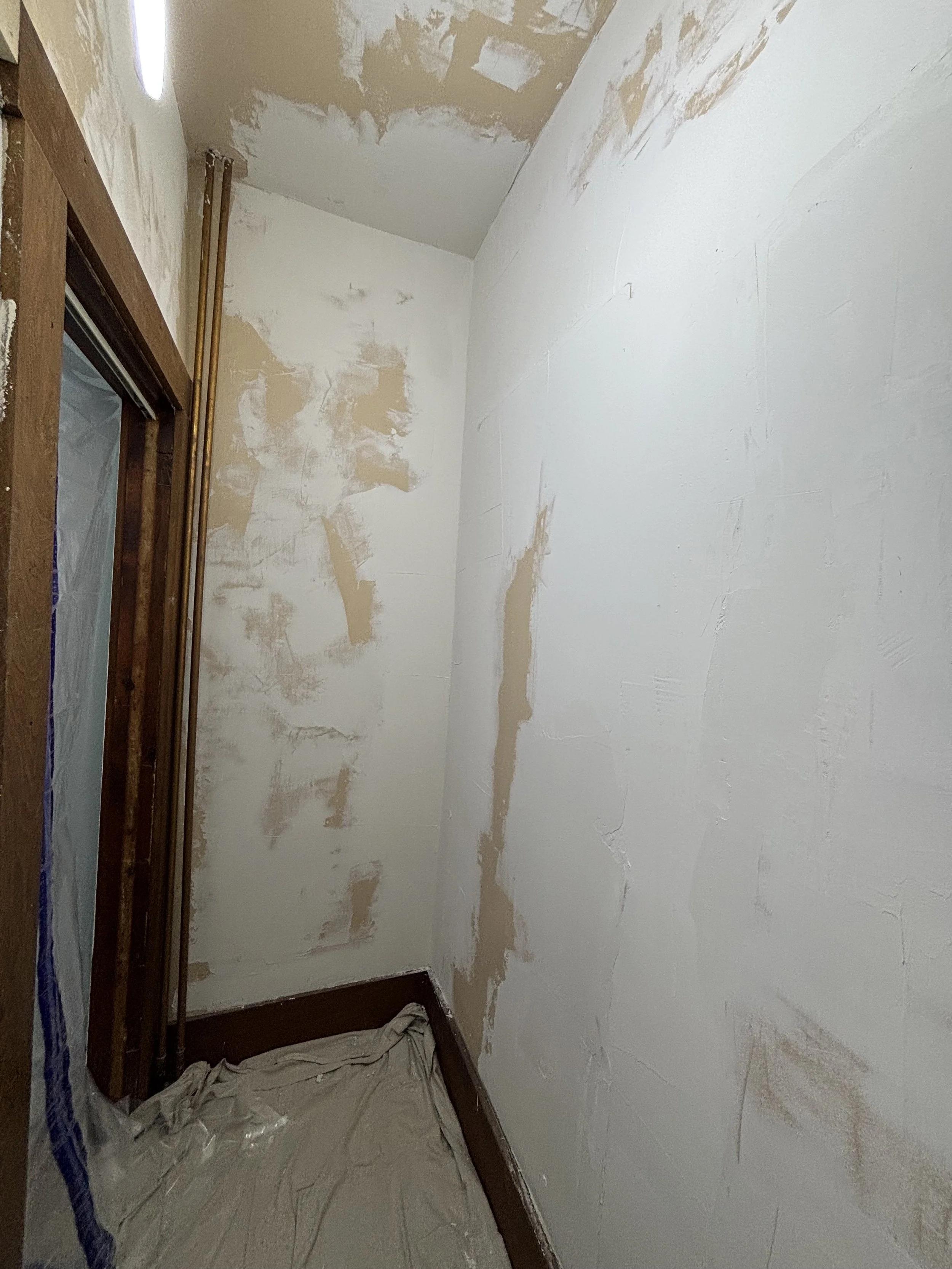 I needed to remove some wood rails, but I was also in no mood to remove the existing walnut trim boards that were about 8” tall. Beautiful wood, to be sure, but the homeowner (rightly) wanted them to match the rest of the home with white painted baseboards. Therefore, they were staying and I was going to float the walls with those boards in place. “What is floating a wall, Jordan?” You see, if you zoom in on this picture, you’ll notice that the plaster has become uneven over the decades and is no longer flat. By building up or “floating” layers of new mud, I can (kinda) flatten the existing wall out. I am by no means a professional mud specialist, as you’ll read later on, but it can be effective. Bring on the mud!