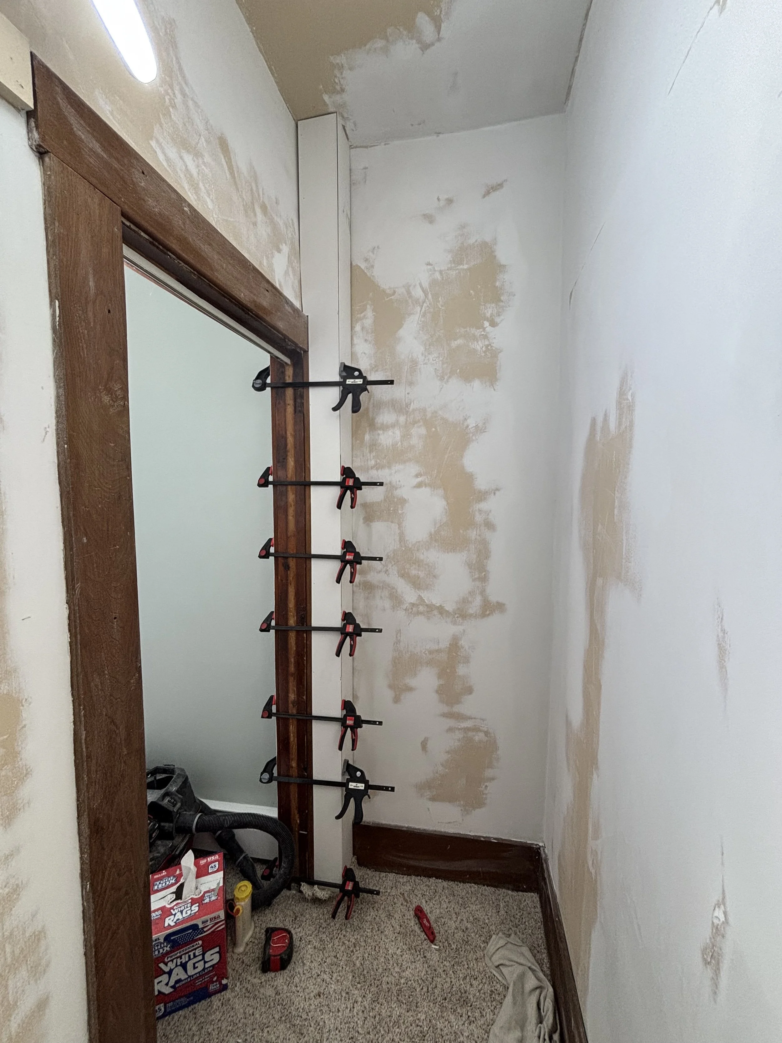 This took a couple days of mudding and sanding, but eventually I got to a place where I felt I could move on to getting the pipes enclosed. I needed to make a couple of decisions about these pipes. What material was I going to use, and how was I going to attach it? I ended up using primed MDF. “Oh no, Jordan! Not MDF! What a crappy material!” No no no. The great thing about MDF is it’s not going to move with changes in relative humidity due to its pressed construction. See, it’s going to be surrounding hot-water-filled pipes, and will undergo a change in temperature often. If I would’ve used pine, it would move and stretch daily and all the joints would crack and look terrible after a week. I did wrap the pipes in foam insulation, but still. The secret sauce of this detail is the use of a locking miter joint that allowed me to glue the miter and have a strong fit at the 90 degree joint. Then, I just needed to install some blocking strips for nailing and I was set. The clamps in the following picture allowed for the glue to dry in place. The other pic is me dying from heatstroke in this sealed up closet while sanding by hand (idiot).